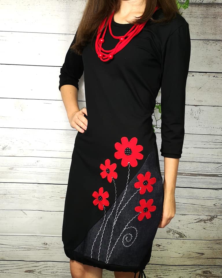 Obleka na črni osnovi s sivim jeansom in živo rdečimi rožicami.