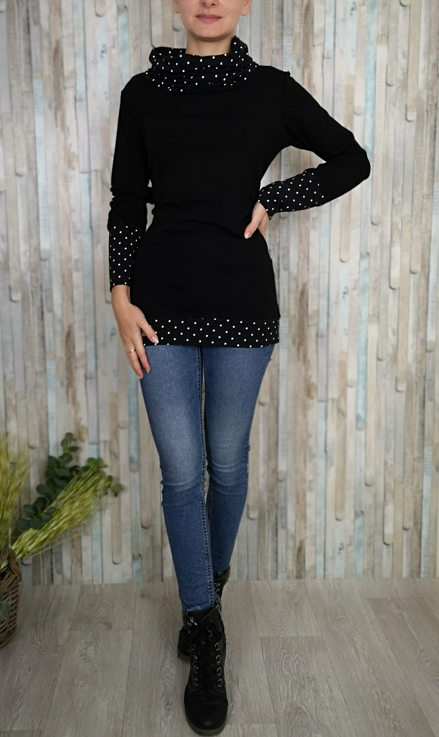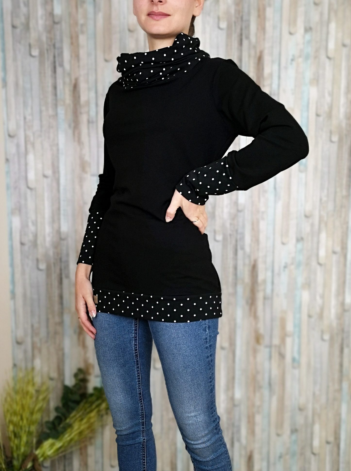Udoben pulover iz bombažne prevešanke 95% bombaž, 5% elastan. Pulover ni povsem oprijet, je pa lepo teliran po telesu.