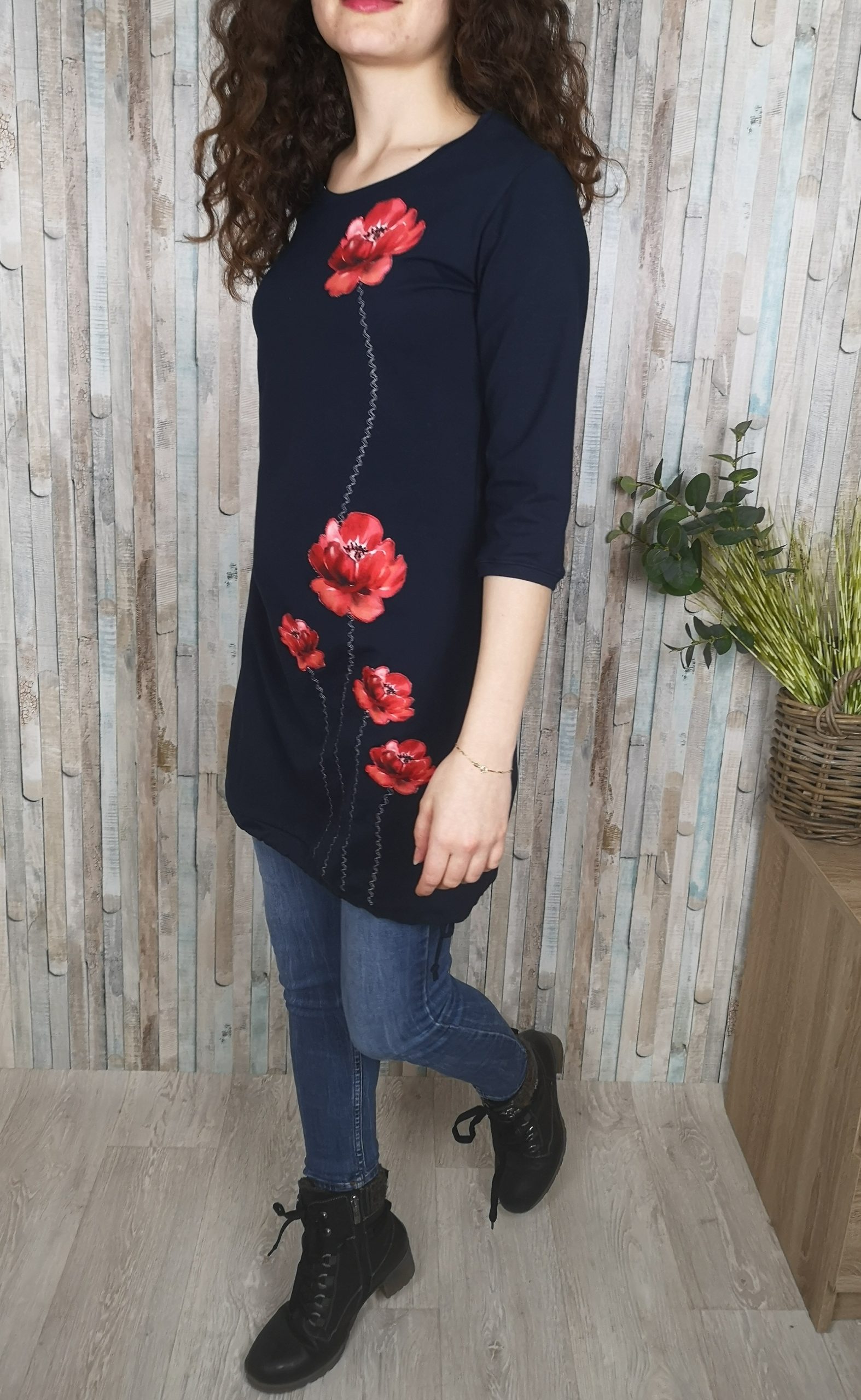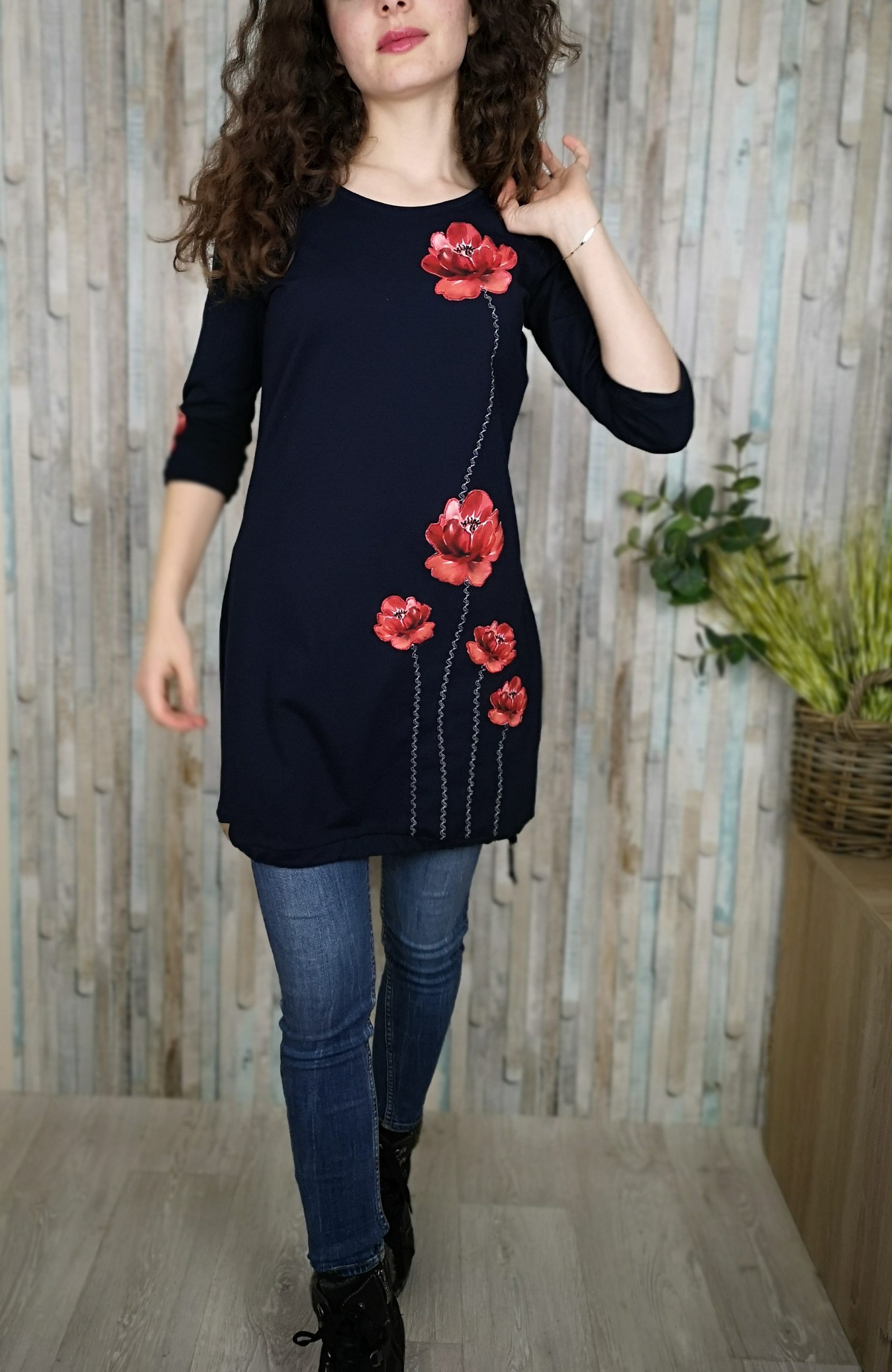 Tunika je iz kvalitetnega jerseya. Sestava 95% bombaž in 5% elastan. Lahko se nosi nad kavbojke, pajkice. Standarda dolžina tunike je 85 cm. V kolikor želite daljšo ali krajšo vpišite v opombe.